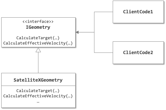 최근 리팩토링을 진행하면서 인터페이스를 분리한 경험이 있습니다. 특정한 위성과 지표 위의 피사체 간의 기하적인 관계를 모델링하고 계산하는 역할을 하는 클래스가 있었습니다. 이 클래스는 위성 기하를 모델링하기 위한 목적으로 작성되었기 때문에, 상당히 방대한 역할을 하고 있었습니다. 어떤 함수는 특정 시각에 위성이 지향하고 있는 지표 상의 지점을 찾는 역할을 하고 있었고, 어떤 함수는 위성의 실질 속도를 계산하는 역할을 하고 있었습니다. 두 함수는 밀접하게 연관되어 있기는 했지만, 서로 다른 클라이언트 코드에서 사용되고 있었습니다.
